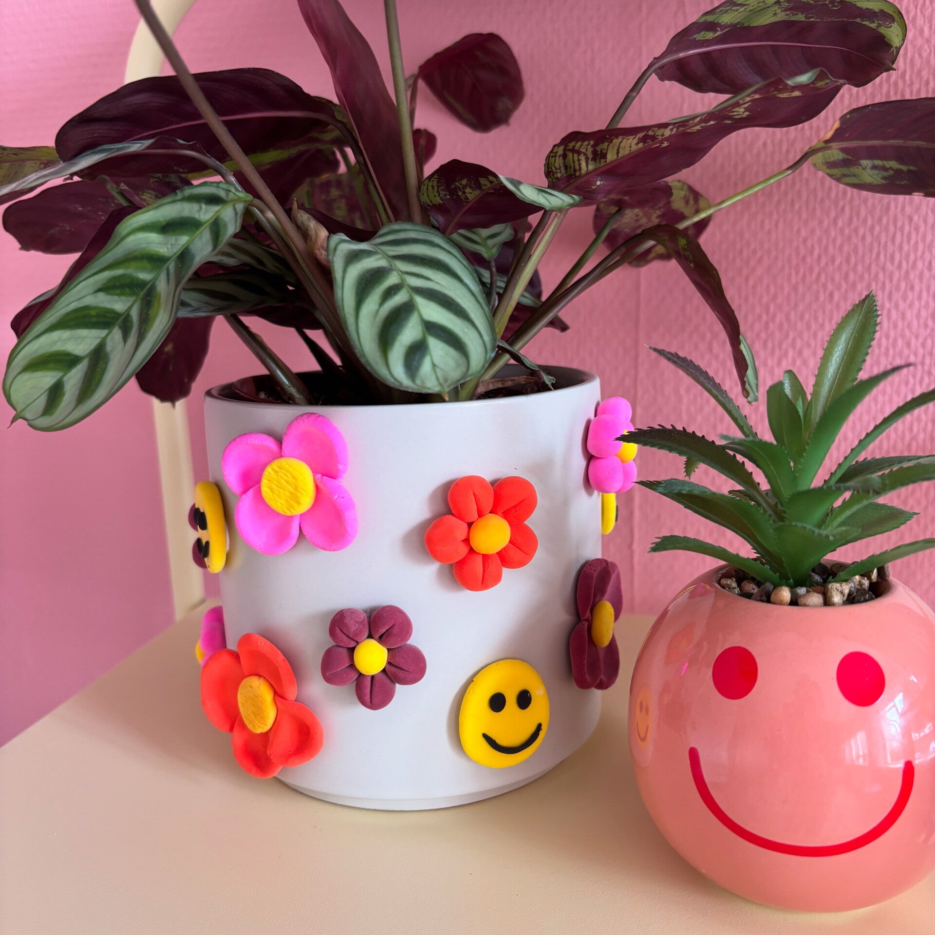 Of je kiest voor het gebruik van klei op je pot. Je schildert je pot dan eerst in 1 basiskleur en maakt daarna de mooiste creaties van zelfdrogende klei.