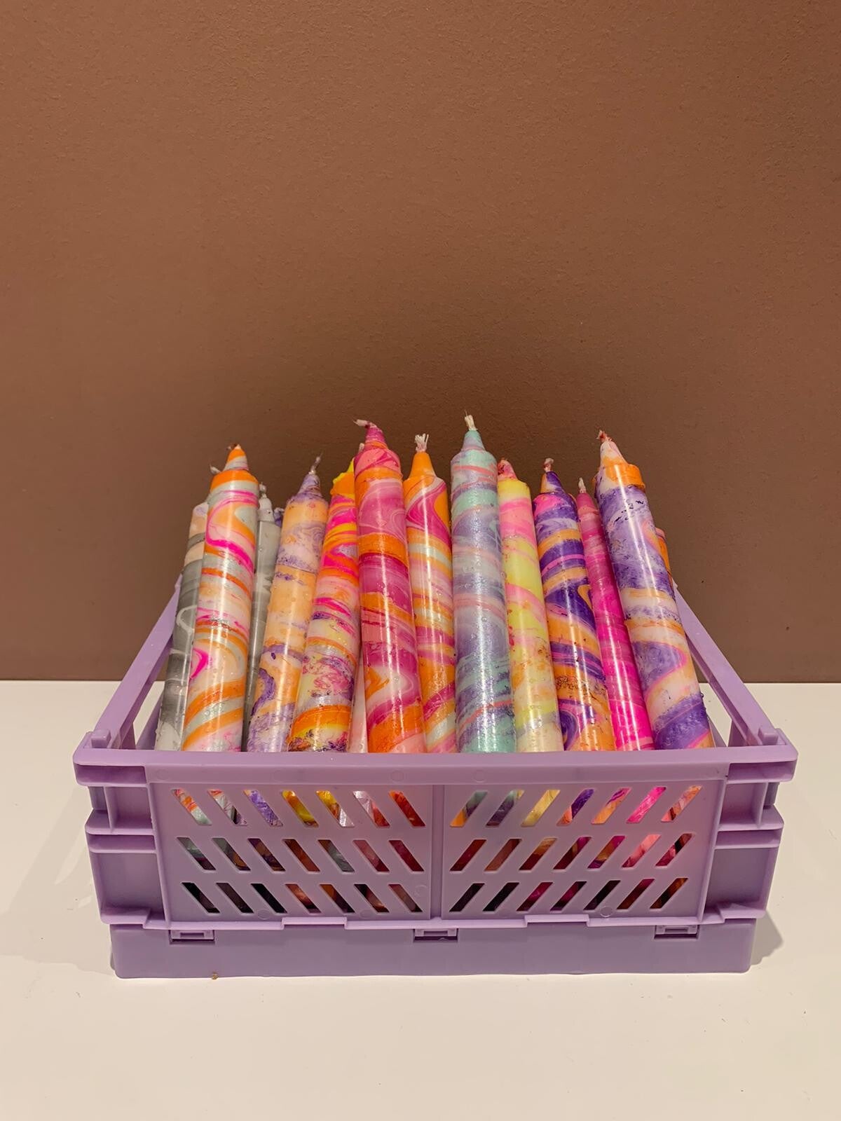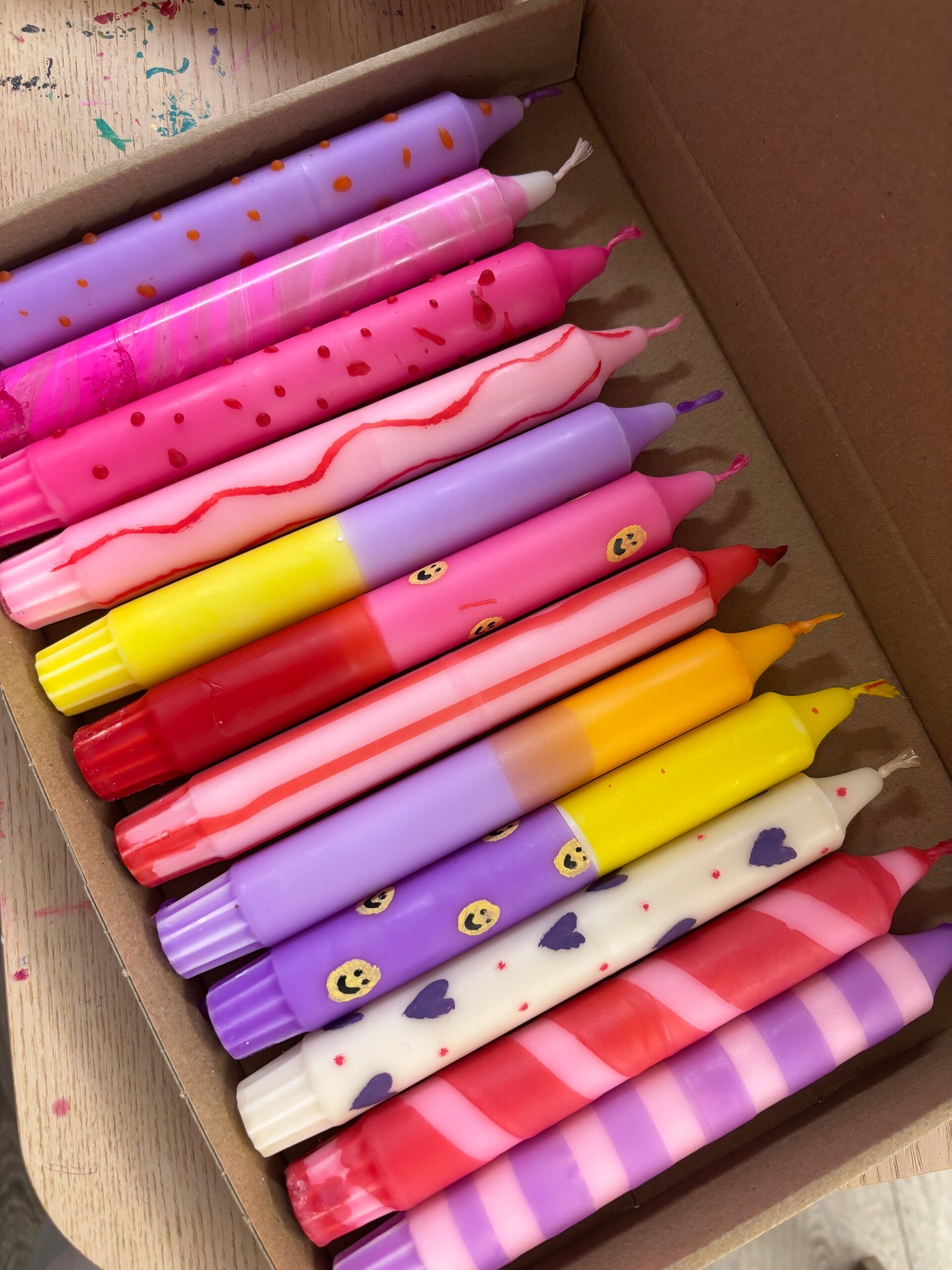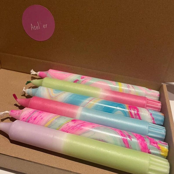Versier je eigen set dinerkaarsen. Je versiert 12 dinerkaarsen; deze kun je dippen, stippen, tapen, marblen. Gebruik speciale acrylstiften of voorzie ze van speciale brandbare glitters.